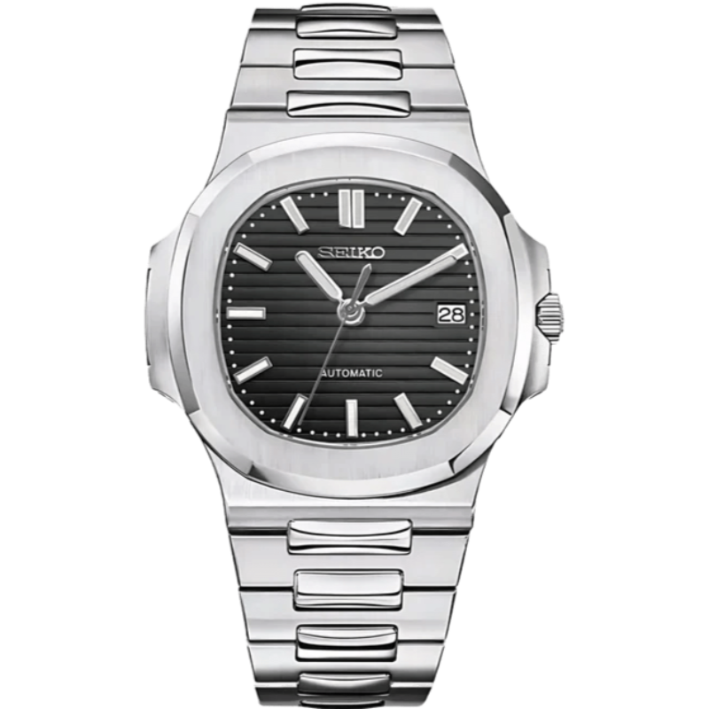 Inspiriert vom ikonischen Nautilus-Design, und ausgestattet mit dem renommierten automatischen Seiko NH35-Uhrwerk, präsentieren wir die Seiko Mod Nautilus. Eine 41 mm hochwertige Uhr, die die perfekte Allianz zwischen Exzellenz und Zugänglichkeit vereint.