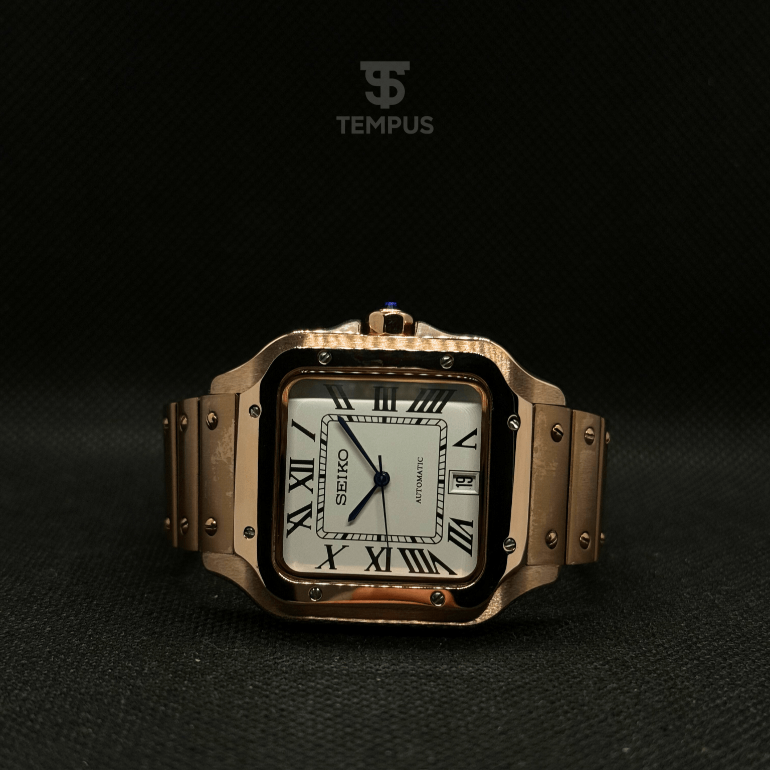 Inspiriert vom ikonischen Santos-Design, und ausgestattet mit dem renommierten automatischen Seiko NH35-Uhrwerk, präsentieren wir die Seiko Mod Santos. Eine 38 mm hochwertige Uhr, die die perfekte Allianz zwischen Exzellenz und Zugänglichkeit vereint.