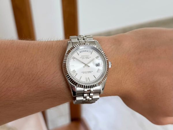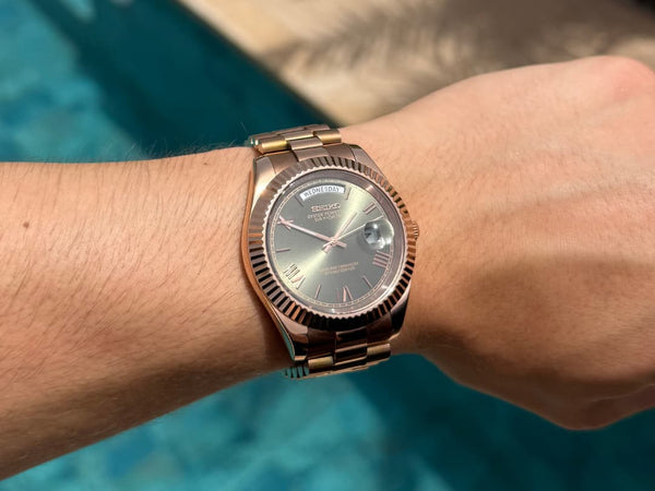 Inspiriert vom klassischen Day-Date-Design, präsentieren wir die Seiko Mod Day-Date. Eine 40 mm hochwertige Uhr, die die perfekte Allianz zwischen Exzellenz und Zugänglichkeit vereint.