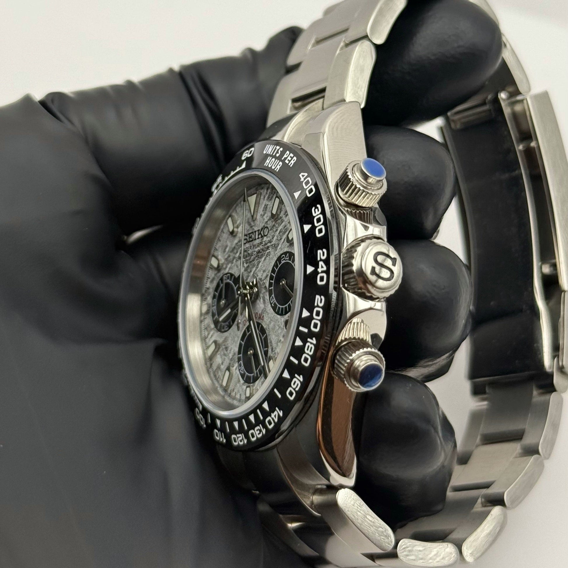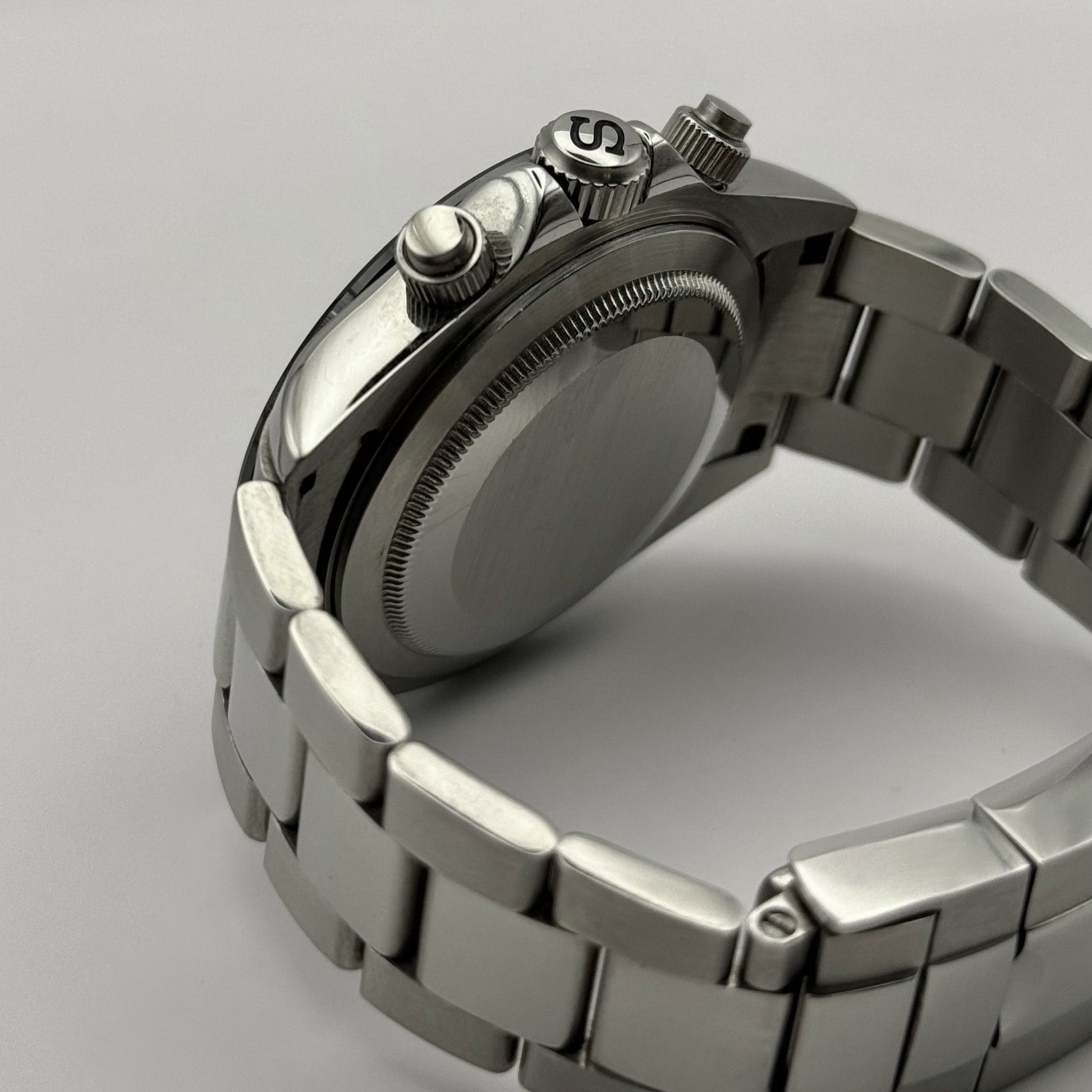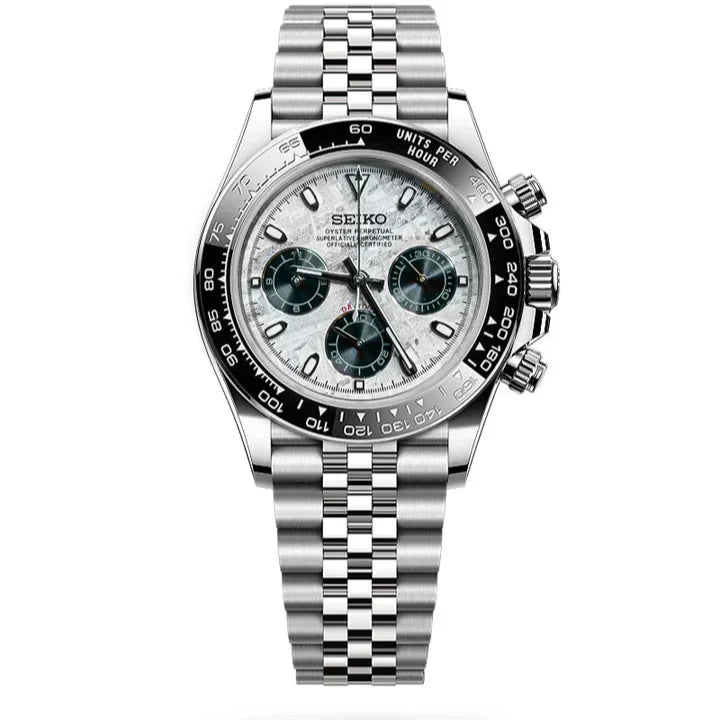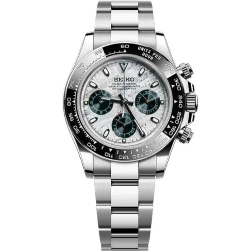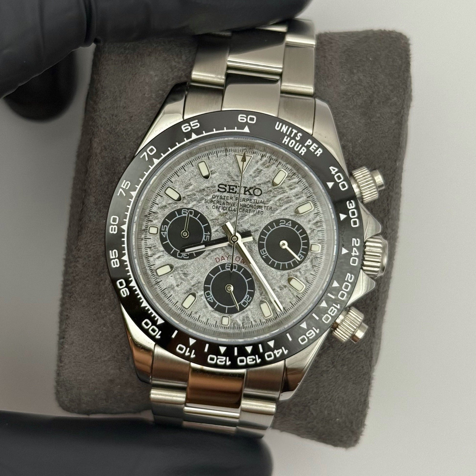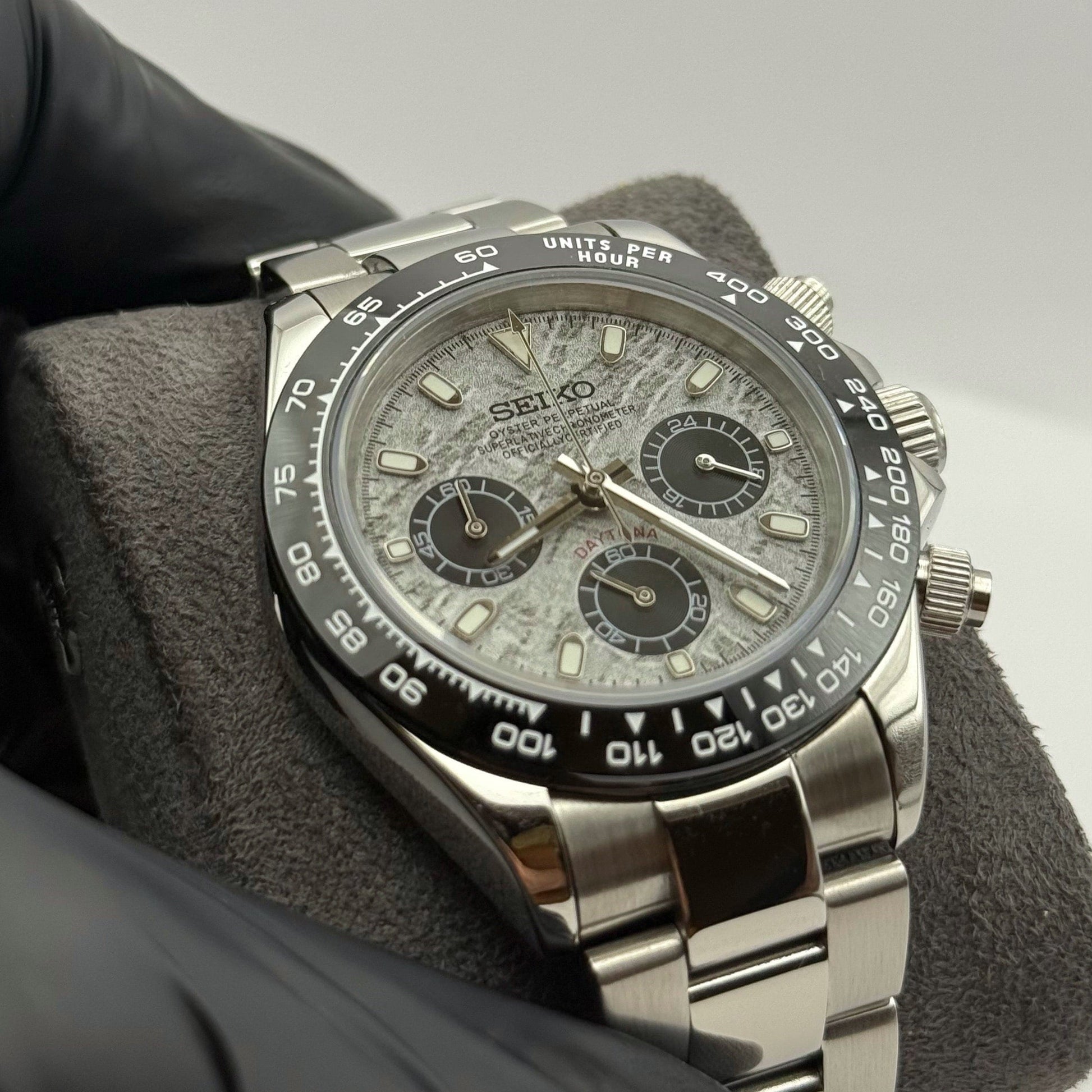 Inspiriert vom ikonischen Daytona-Design, und ausgestattet mit dem renommierten hybriden Seiko VK63-Uhrwerk, präsentieren wir die Seiko Mod Daytona. Eine 40 mm hochwertige Uhr, die die perfekte Allianz zwischen Exzellenz und Zugänglichkeit vereint.