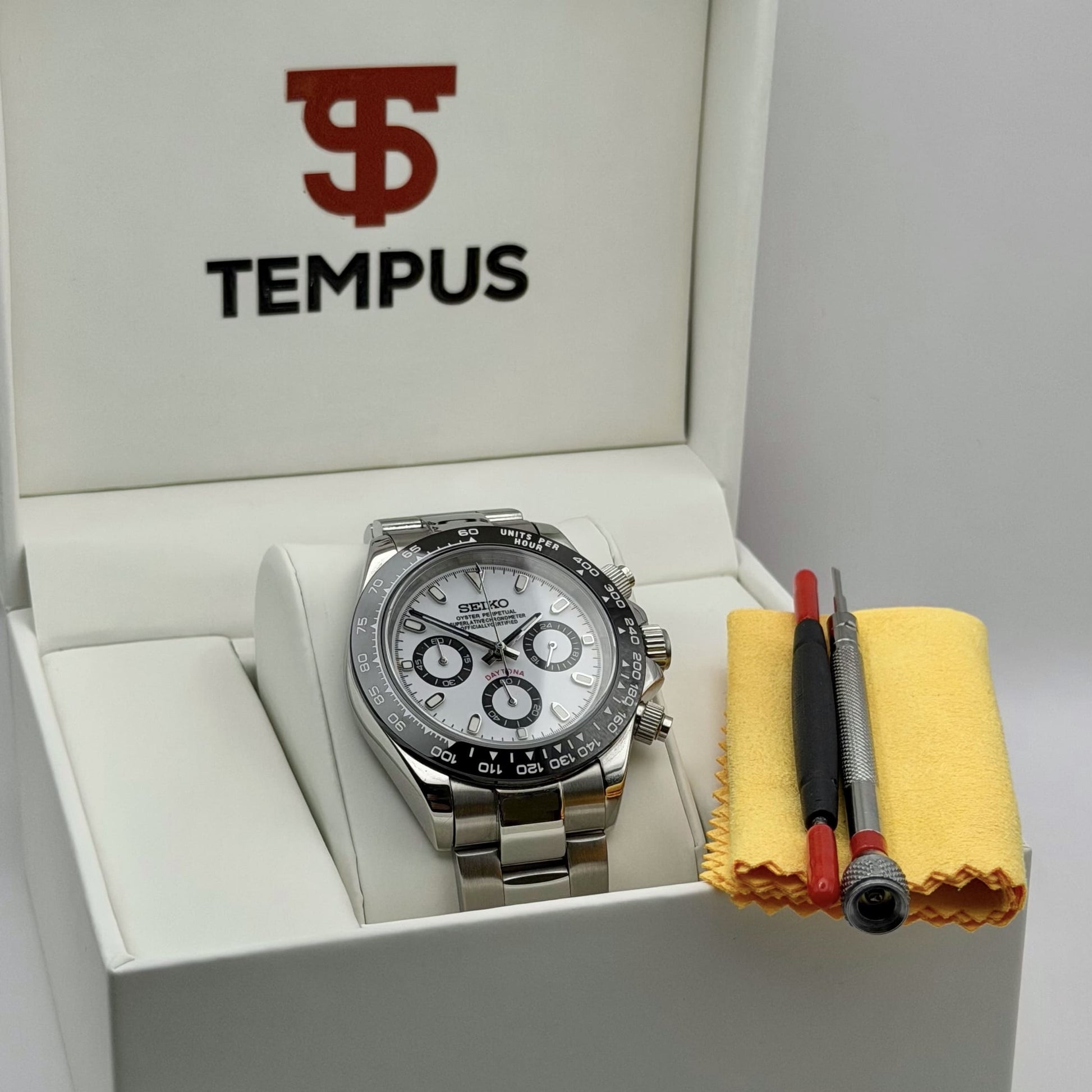 Inspiriert vom ikonischen Daytona-Design, und ausgestattet mit dem renommierten hybriden Seiko VK63-Uhrwerk, präsentieren wir die Seiko Mod Daytona. Eine 40 mm hochwertige Uhr, die die perfekte Allianz zwischen Exzellenz und Zugänglichkeit vereint.