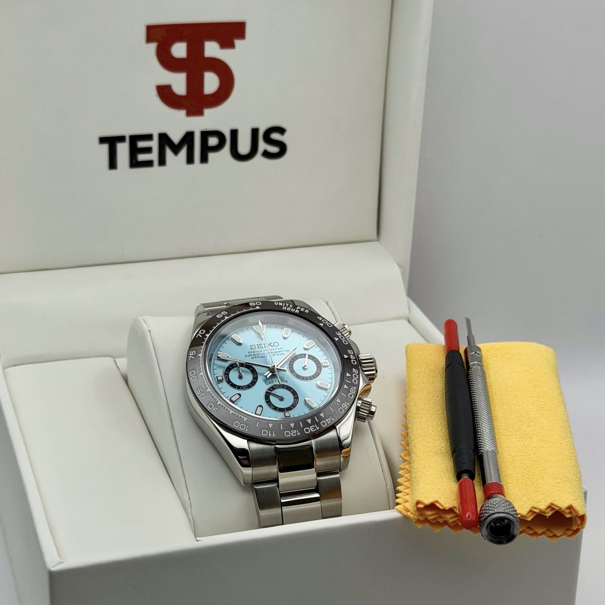 Inspiriert vom ikonischen Daytona-Design, und ausgestattet mit dem renommierten hybriden Seiko VK63-Uhrwerk, präsentieren wir die Seiko Mod Daytona. Eine 40 mm hochwertige Uhr, die die perfekte Allianz zwischen Exzellenz und Zugänglichkeit vereint.
