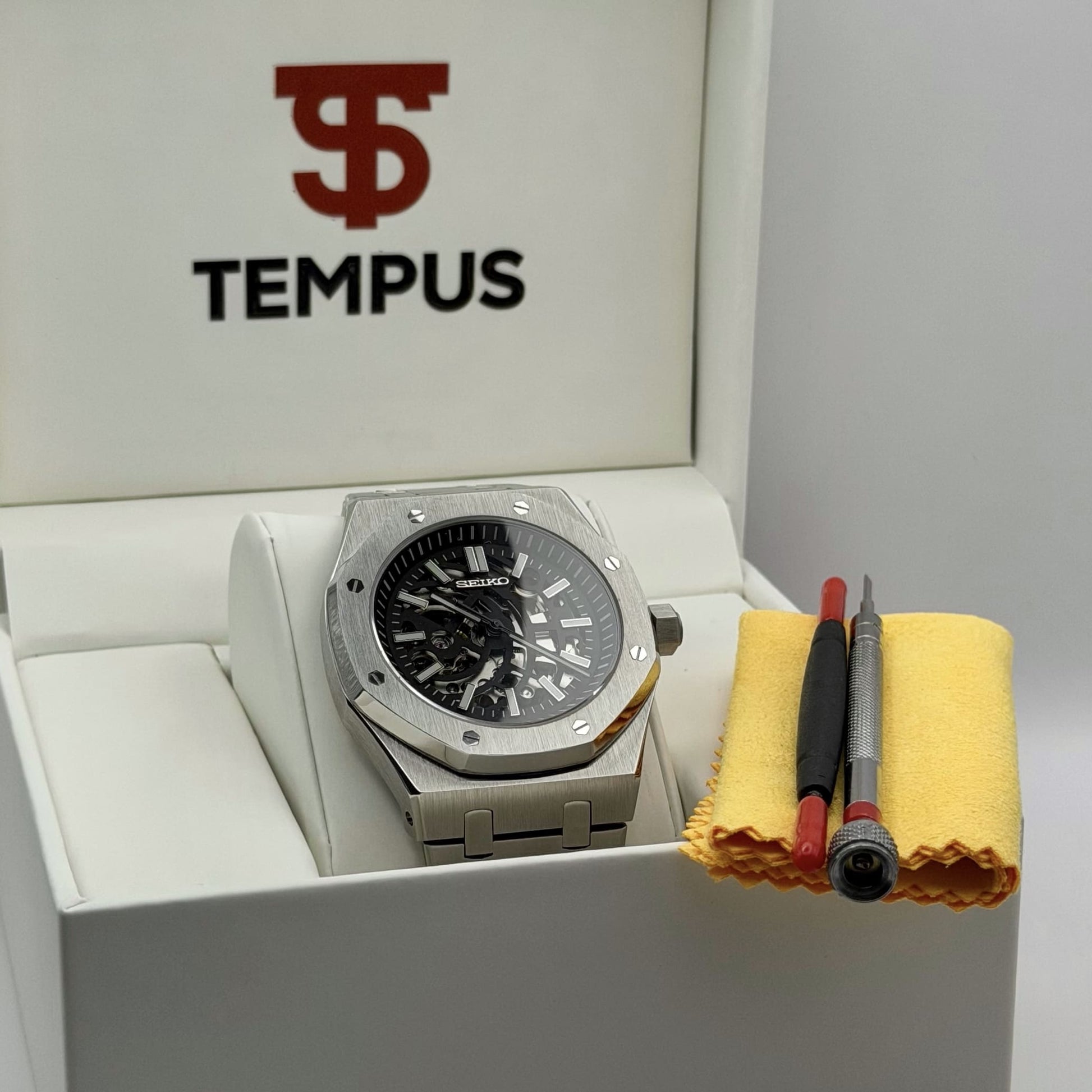 Inspiriert vom ikonischen Royal Oak-Design, und ausgestattet mit dem renommierten automatischen Seiko NH72-Skelett-Uhrwerk, präsentieren wir die Seiko Mod Royal Oak. Eine 41 mm hochwertige Uhr, die die perfekte Allianz zwischen Exzellenz und Zugänglichkeit vereint.